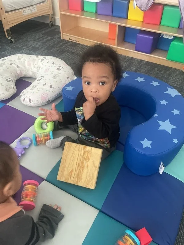 The infants’ classroom, for children ages six weeks to approximately sixteen months, is a special place where our youngest students receive quality care while having opportunities to grow, explore, and learn! Unlike other classrooms, families provide a schedule specific to their child’s daily routine at home to maintain consistency. Our staff can assist with this endeavor if desired and will incorporate other activities into the schedule to make for an action-packed day. All infants have a designated crib for personal space while having access to various infant equipment and shared space where babies can socialize and explore under guided supervision. The classroom is split into two sides: non-mobile and mobile. Once students transition to the mobile side, they work to acclimate to a more universal schedule and routine in preparation for the toddler age group.